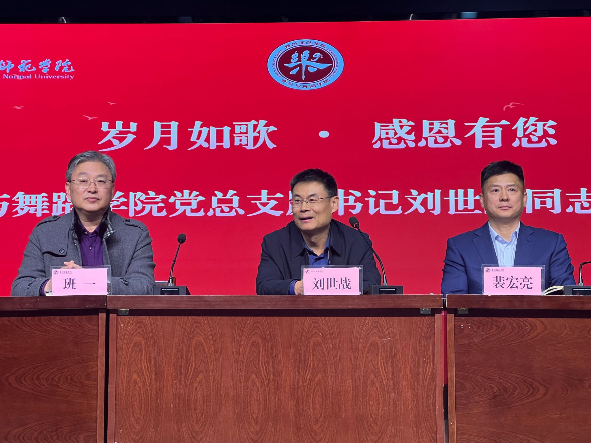 在热烈的掌声中,刘世战同志动情回顾了在学校与学院的工作岁月。他深切感谢组织的培养与信任、历任同事的支持与配合,以及全体师生的理解与陪伴。他表示,虽告别工作岗位,但始终心系学院发展,将一如既往地关注、支持学院建设,并寄语全院师生珍惜当下机遇、勇担时代使命,携手并肩为音乐与舞蹈学院的美好明天不懈奋斗。