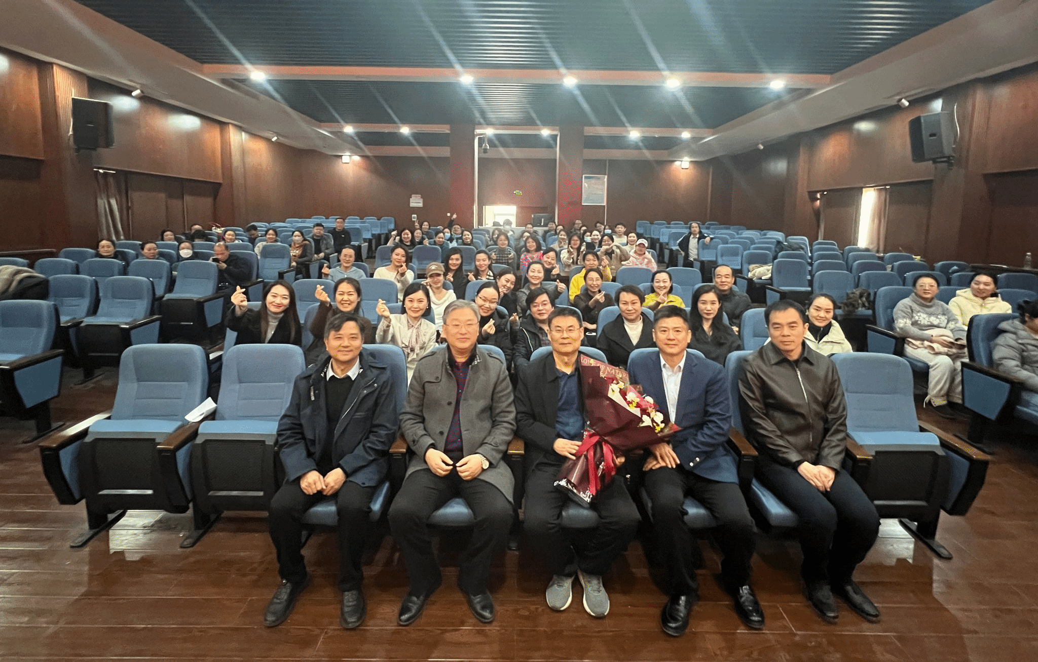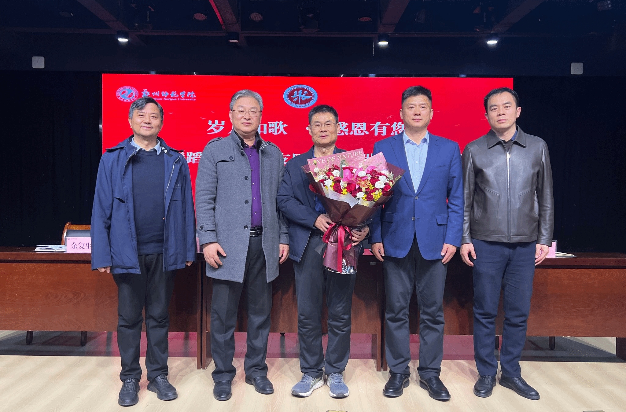 仪式最后,教师代表吴阳为刘世战同志送上鲜花,全体人员共同合影留念,定格这一温馨瞬间。此次荣退仪式,既是对一位教育工作者坚守奉献的崇高致敬,更彰显了学院尊师重教、薪火相传的优良传统,为学院高质量发展注入了温暖而坚定的力量。