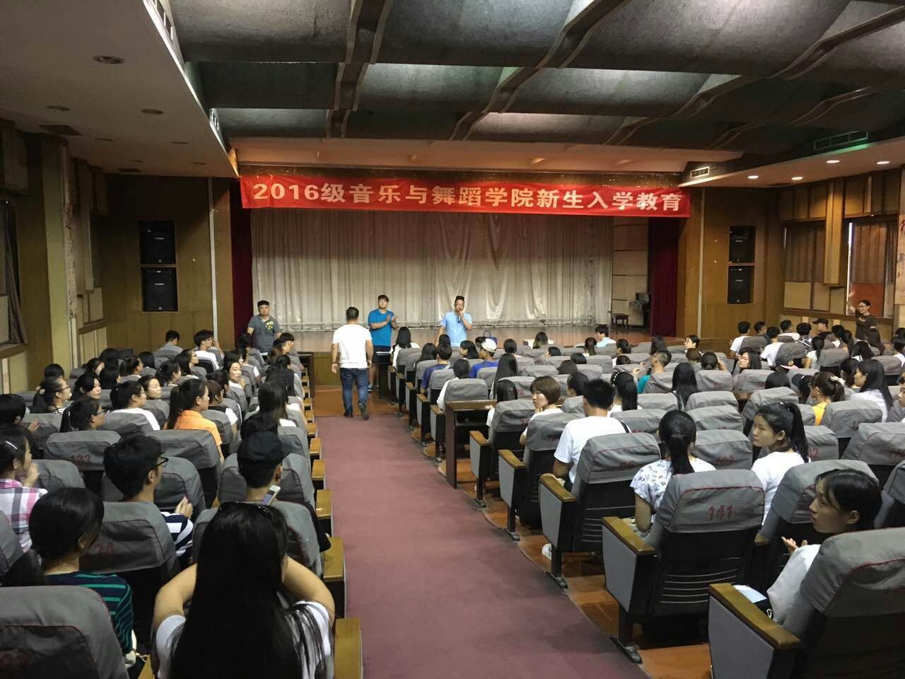 9月7号下午,所有新生的音乐与舞蹈学院4楼音乐厅由团总支书记梁向阳给大家开展第一次的开学教育并且由学生们与班主任,代理班主任,辅导员以及军训的教官见面。