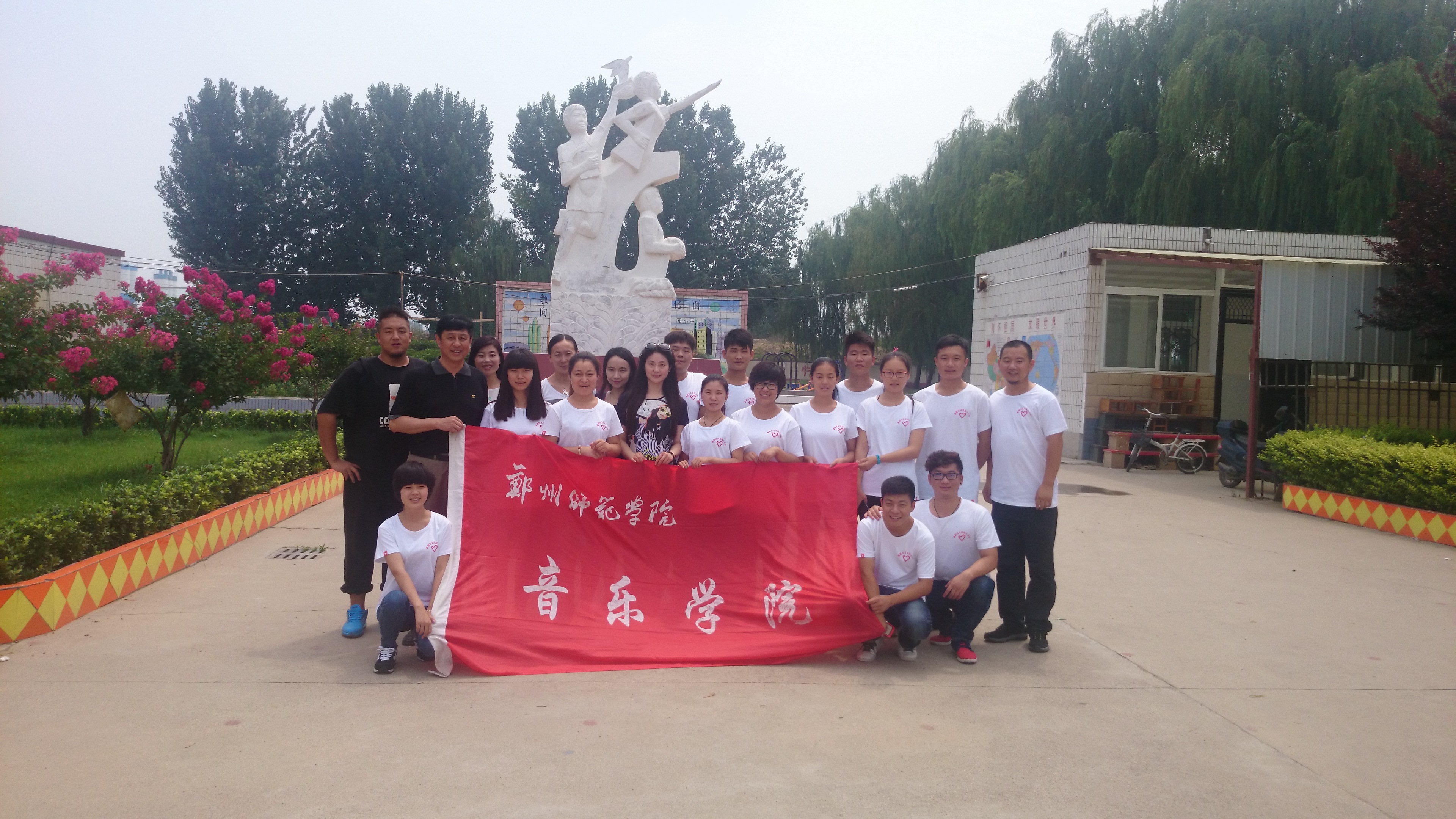 学校领导在音乐与舞蹈学院团总支副书记梁向阳和辅导员老师李欣娜的带领下,与弓庄小学王校长进行交流,随后视看了朗诵班、美术班、合唱班和英语班的教学情况和学生的住宿环境,并对此次支教情况表示非常满意,也对支教队伍的学生们给予厚望,最后在弓庄小学的广场合影留念。