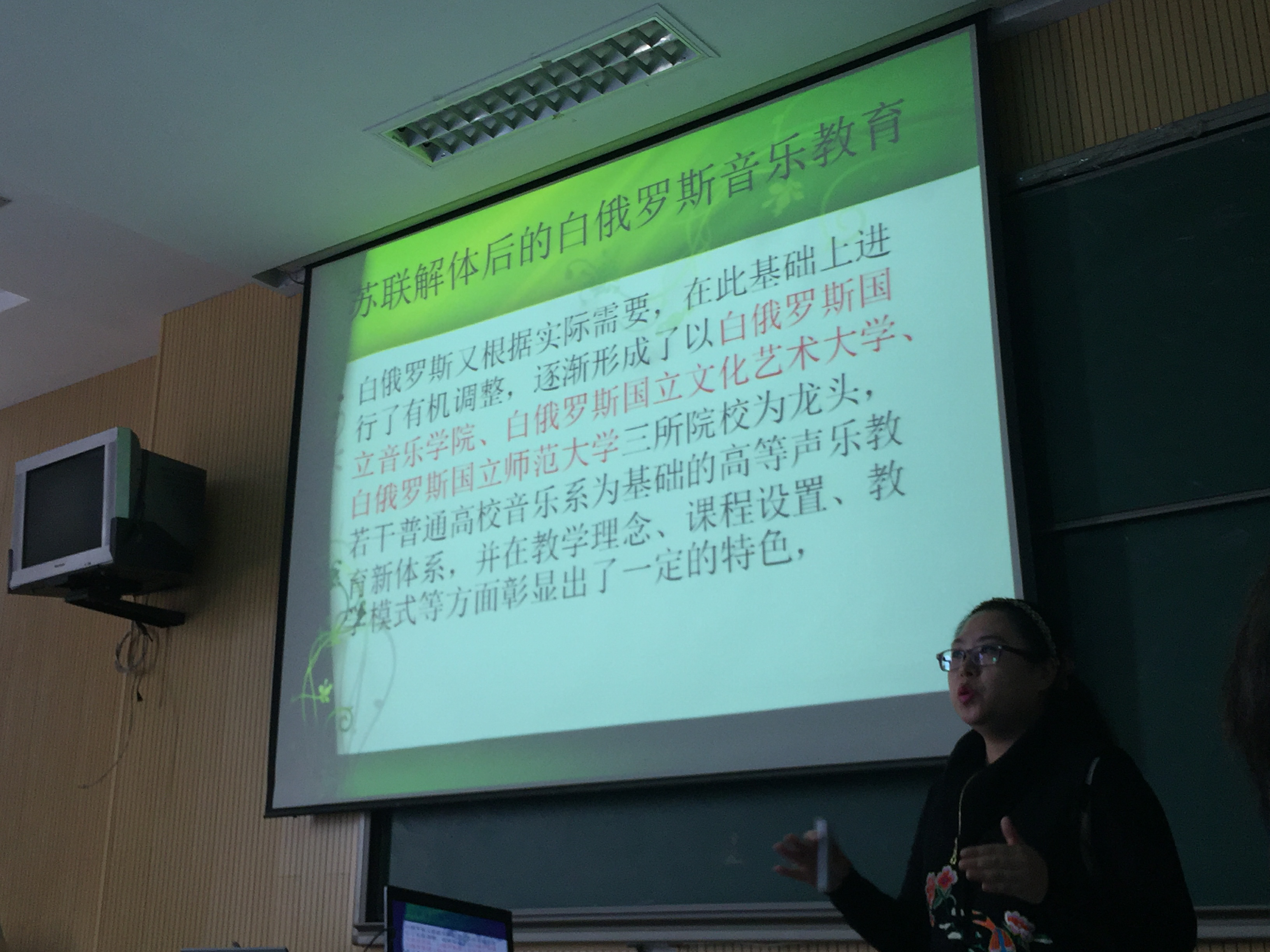 首先进行的曹姝莉博士,她的讲座题目是《走进白俄罗斯艺术类高校》,深入剖析了俄罗斯和白俄罗斯高等院校音乐教育发展历程以及声乐教学的特色,使同学们在了解俄罗斯音乐教育课程体系的同时,也对我国现行的教育制度有了更加深入的理解。
