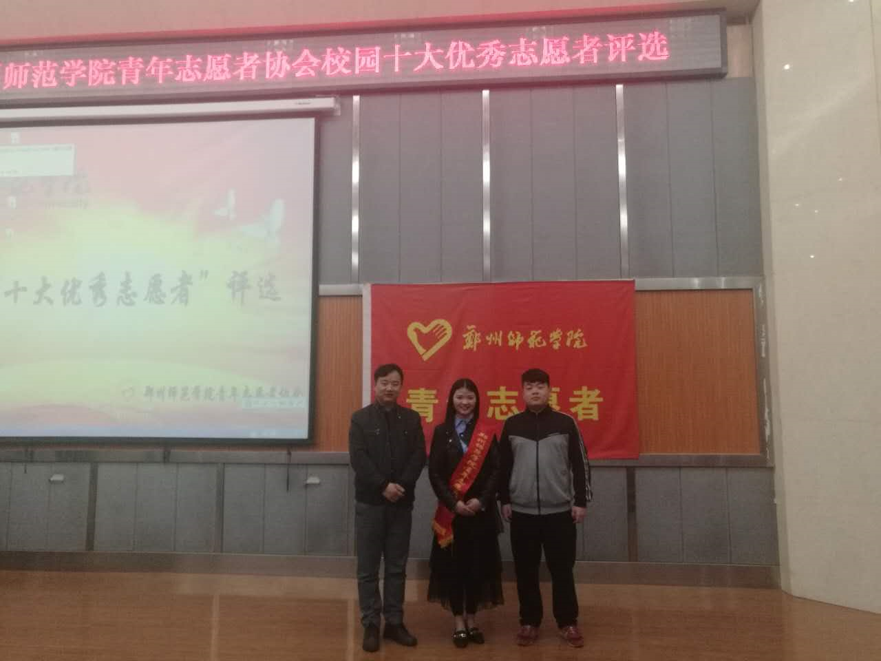 2017年4月5日,郑州师范学院青年志愿者协会成功举办了“校园十大优秀志愿者”评选活动,在通过一个月的紧张策划和准备,经过网上投票等流程以及现场紧张的演讲投票之后,音乐与舞蹈学院S15声乐表演班的姚弦歌同学在此次活动中表现优秀并取得优异成绩。
