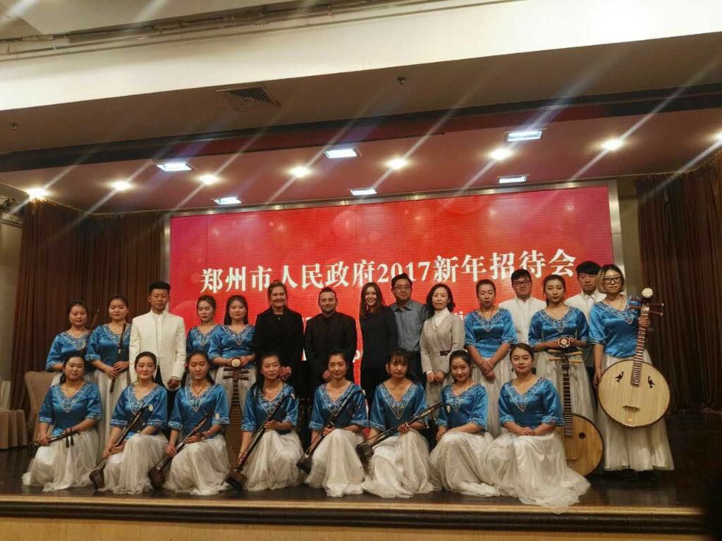 2016年12月14日下午,郑州市人民政府在黄河饭店举行2017年新年招待会。我校外教代表和来自美国、英国、德国、加拿大、澳大利亚、新西兰、奥地利、克罗地亚、白俄罗斯、乌克兰等国家在郑工作的外籍专家、学者、三资企业代表和港澳台侨资企业代表等出席招待会。音乐与舞蹈学院实验民乐团在崔跃芳老师的带领下参加了此次活动。