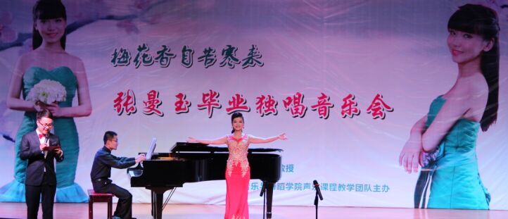 张曼玉用一首维吾尔族民歌《曲蔓地》拉开了独唱音乐会的序幕,演唱活泼、热情、声音明亮,获得同学热烈掌声。从《一杯美酒》、《七月的草原》到《在水一方》、《高山流水》等再到歌剧《木兰诗篇》中花木兰的经典咏叹调《我的爱将与你相伴终生》;音乐会作品跨度大、风格多样,对于本科生来说具有挑战性,但张曼玉演唱起来自然、真切、尺寸把握到位,较好的完成了每一首作品。尤其是演唱的陕北民歌《拉手手》更是味道十足,彰显了对民族声乐演绎风格的实力。音乐会尾声张曼玉深情演唱了《我的好妈妈》,将此歌献给四年来对她付出辛苦劳动的恩师王艳霞教授,同时也献给培养她的音乐与舞蹈学院的所有老师们!张曼玉满含热泪的演唱感动了坐在台下的所有老师、同学,音乐会在热烈的气氛中圆满落幕。
