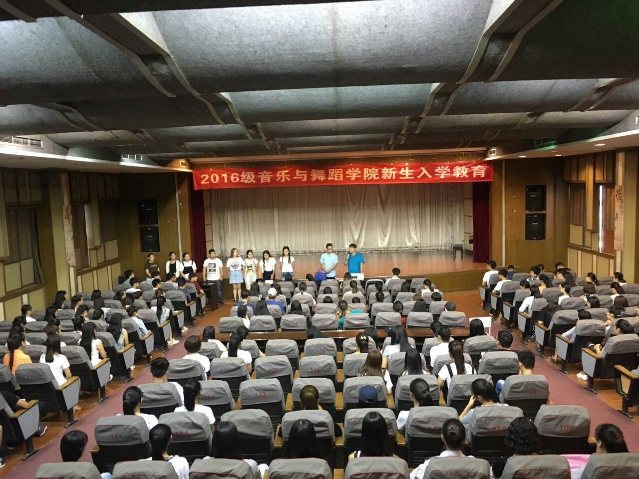 9月7号下午,所有新生的音乐与舞蹈学院4楼音乐厅由团总支书记梁向阳给大家开展第一次的开学教育并且由学生们与班主任,代理班主任,辅导员以及军训的教官见面。