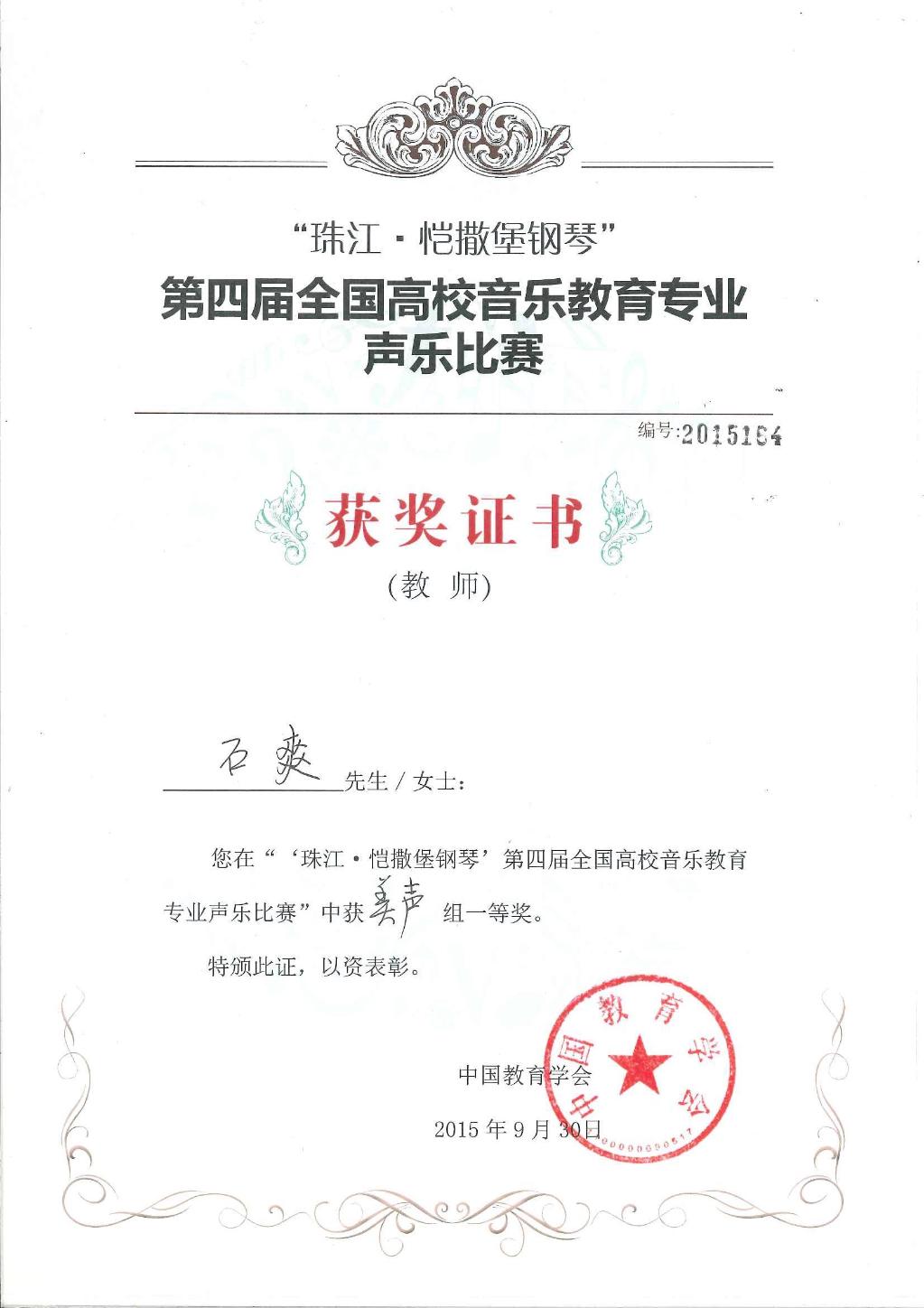 近日,音乐与舞蹈学院青年声乐教师石爽在2015第四届“珠江· 凯撒堡”全国高校声乐专业教师比赛中再次荣获一等奖。此次获奖是继2011年第二届、2013年第三届分别囊获一等奖之后,第三次拿到此类比赛一等奖,成功获得了三连冠的荣誉称号!