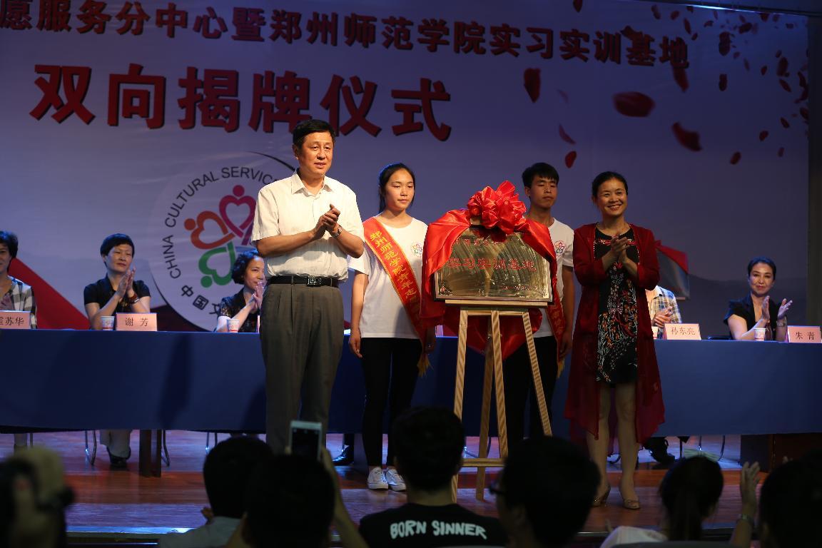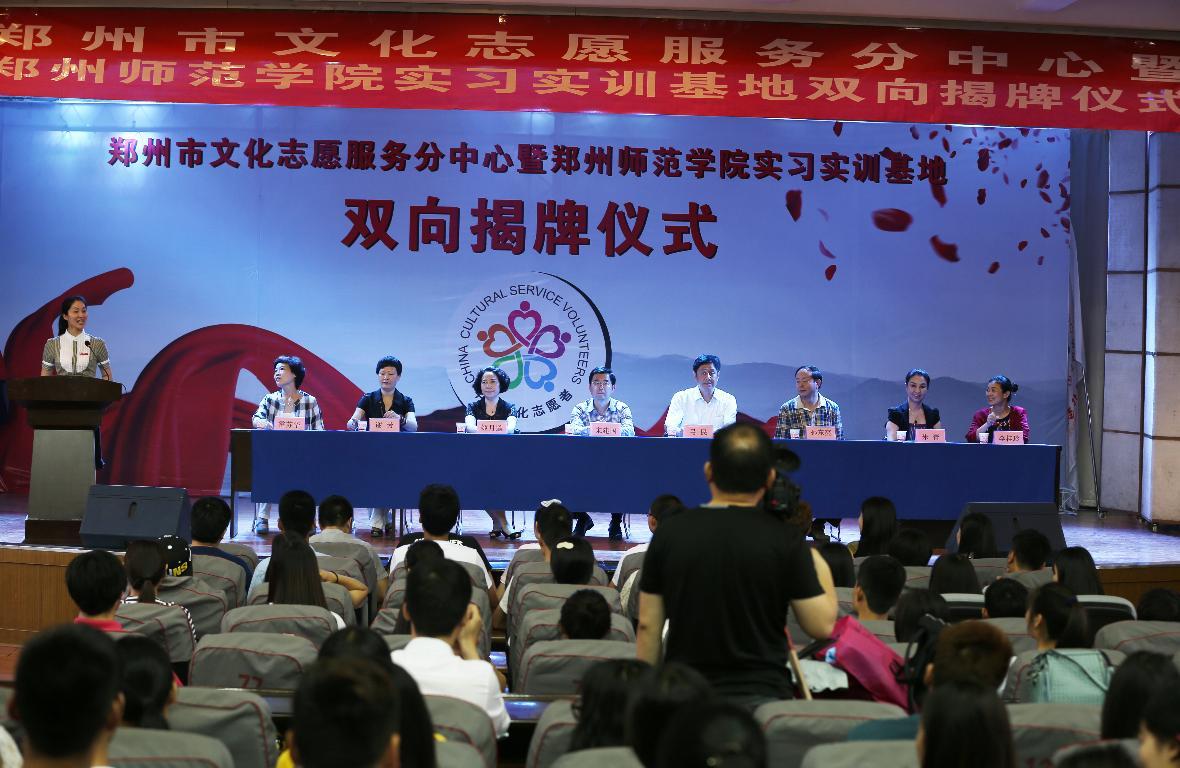 2015年5月26日下午,郑州市文化志愿者服务中心在郑州师范学院设立分中心、郑州师范学院在郑州市群艺馆设立实习实训基地双向揭牌活动在音乐与舞蹈学院音乐厅隆重举行。市委宣传部副部长宋建国,市文明办副主任姬月莲,郑州师范学院党委副书记弓民,郑州师范学院宣传部副部长、文明办主任谢芳,市群艺馆馆长李桂玲等领导及部分师生代表400余人参加了活动。