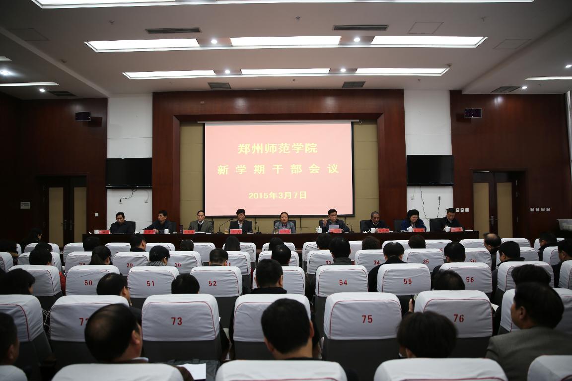 针对本学期工作,党委书记于向英指出,一是要依法治校。党的十八届四中全会提出了依法治国的理念,依法治国结合到教育系统,就是全面推进依法治教。结合我们学校,就是要贯彻落实《郑州师范学院章程》,推进依法治校。要围绕《章程》不断加强学习宣传,使《章程》的内容内化于师生之心。要树立三个理念,质量至上的理念、责任担当的理念、改革创新的理念。二是要从严治党。要牢牢把握高校意识形态工作的领导权和主动权,要坚持高压反腐新常态,要搞好党的群众路线教育实践活动的后期整改,要找出需要持续推进的问题、尚未启动的问题和新征集的问题,建立2015年新的整改台帐,要聚焦突出问题,有序开展个性问题即知即改、共性问题专项治理、多方面问题联动整改,始终保持持续整改、动态整改的工作态势,以扎实整改兑现承诺,以活动成效取信师生。要加强干部作风建设,领导干部要树立三种意识,主动意识、全局意识和实干意识。