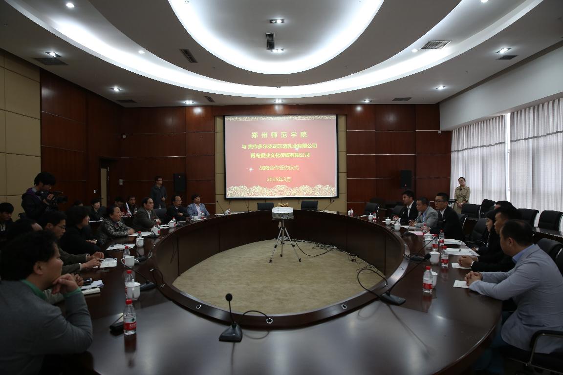 3月30日下午,我校与焦作多尔克司示范乳业有限公司、青岛报业文化传播有限公司签署战略合作协议,仪式在图书馆十楼会议室举行,校党委书记于向英,副校长王北生,著名青年指挥家、美国南加州爱乐乐团艺术总监、美国科洛纳音乐学院院长苏文星,焦作多尔克司示范乳业有限公司董事长戴士伟,乳品事业部总经理崔玉成,海外事务部总经理张哲,招商部经理孔德安,行政部主管陈胜楠出席仪式。