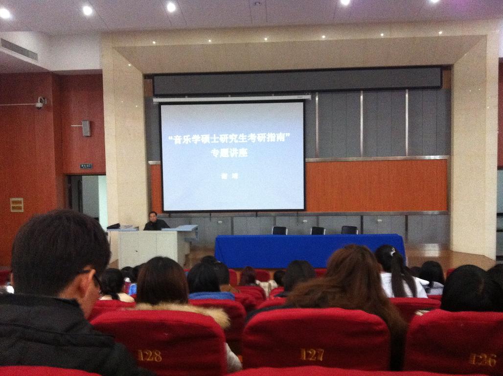 2014年12月09日14:10,由理论教学部主办的“音乐理论讲堂” 在新校区综合楼A301报告厅举行。本次讲座由理论教学部谢靖老师主讲,题目是“音乐学硕士研究生考研指南”。