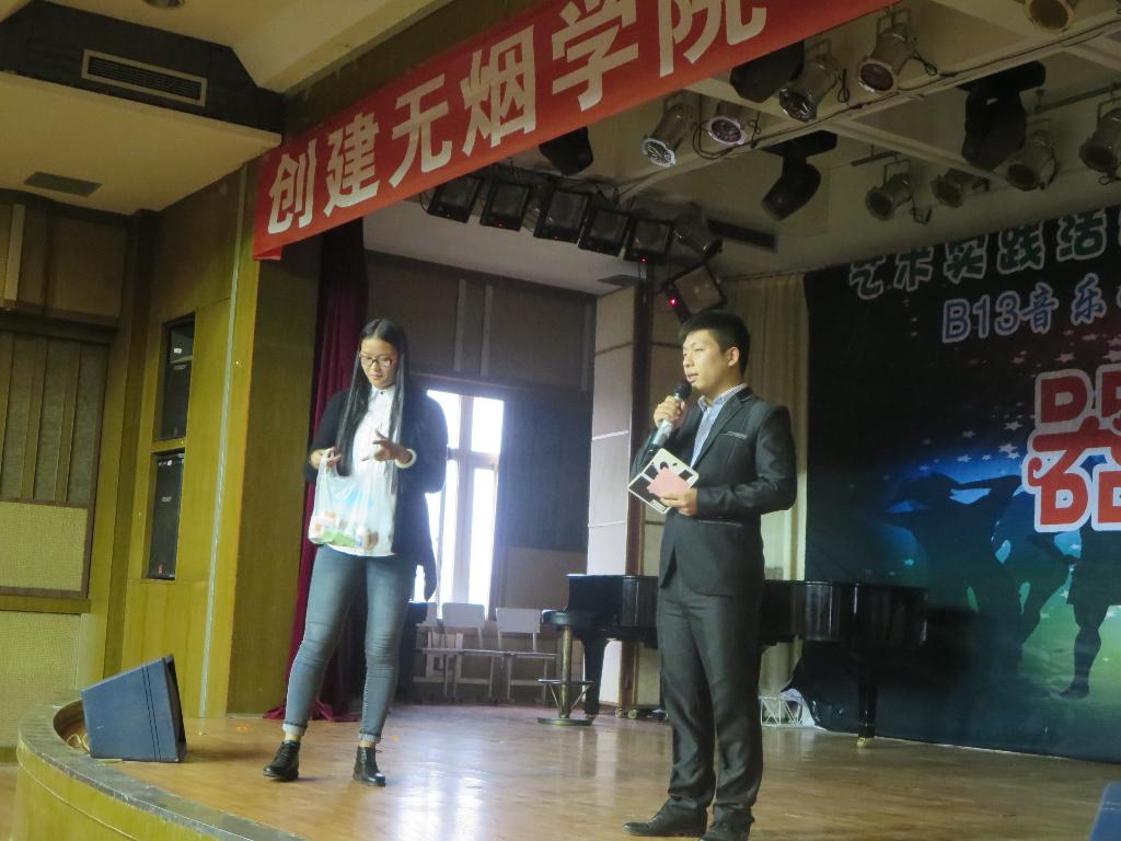 吸烟已逐渐成为一个不可忽视的社会问题。目前,吸烟行为在大学生中普遍存在,严重影响了他们的学习和健康。我院针对这些热点问题,把活动分为四个环节,第一章为演讲关于吸烟危害的征文,详细的介绍吸烟为什么对健康百害而无一利。第二章为播放禁烟宣传片,让同学们更直观认识到烟草对人体健康的威胁,同时突出创建无烟学院的重要性。第三章是音乐与舞蹈学院青年志愿者协会14级新干事刘翼含上台发表演说,警醒同学们,要摒弃吸烟陋习,创造健康新时尚。第四章由主持人上台开始有奖问答环节,提问有关吸烟危害性的问题,回答正确的同学可以获得小奖品。