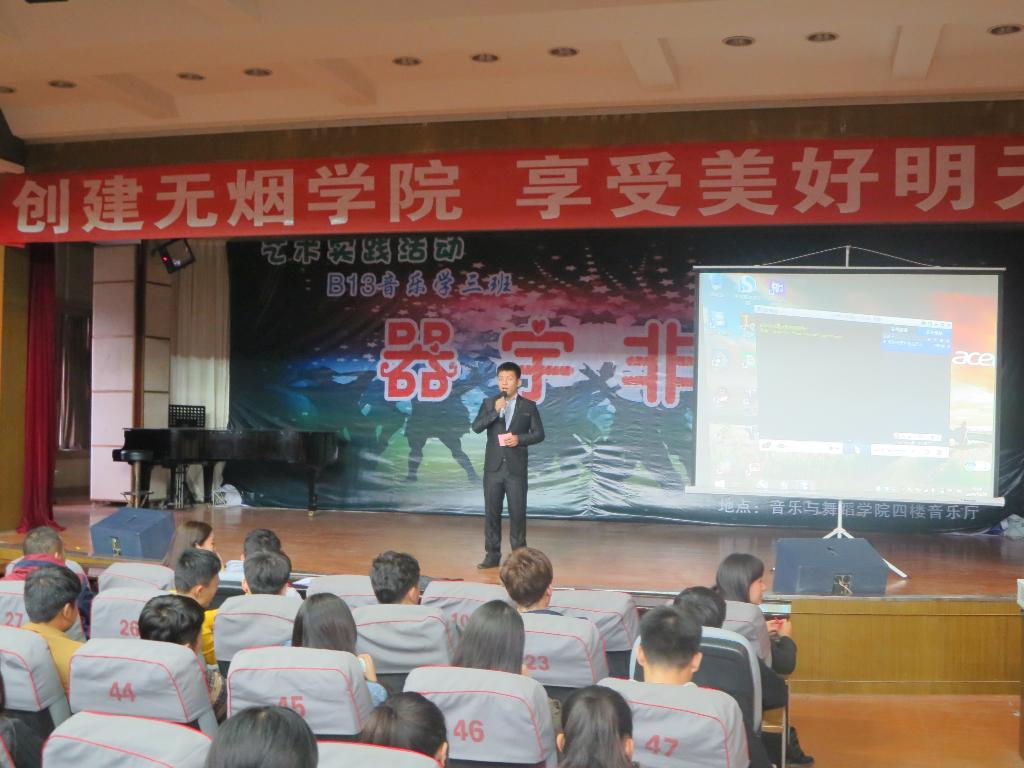 2014年10月28日下午4点,音乐与舞蹈学院在西校区6号楼四楼音乐厅成功举办“创建无烟学院,享受美好明天”主题教育活动。本次活动由音乐与舞蹈学院文明督导员戚晓思老师组织,音乐与舞蹈学院青年志愿者协会策划,14级全体学生参加了此次活动。