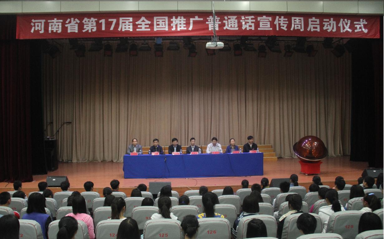 2014年9月15日上午,由河南省教育厅主办,郑州师范学院承办的“河南省第十七届全国推广普通话宣传周”启动仪式在我校隆重举行。教育厅副巡视员刘湘平,教育厅语言文字应用管理处处长闫俊山,校党委书记于向英,校长赵健,党委副书记、工会主席弓民,副校长王北生出席启动仪式。启动仪式由河南省教育厅语言文字应用管理处处长闫俊山主持。