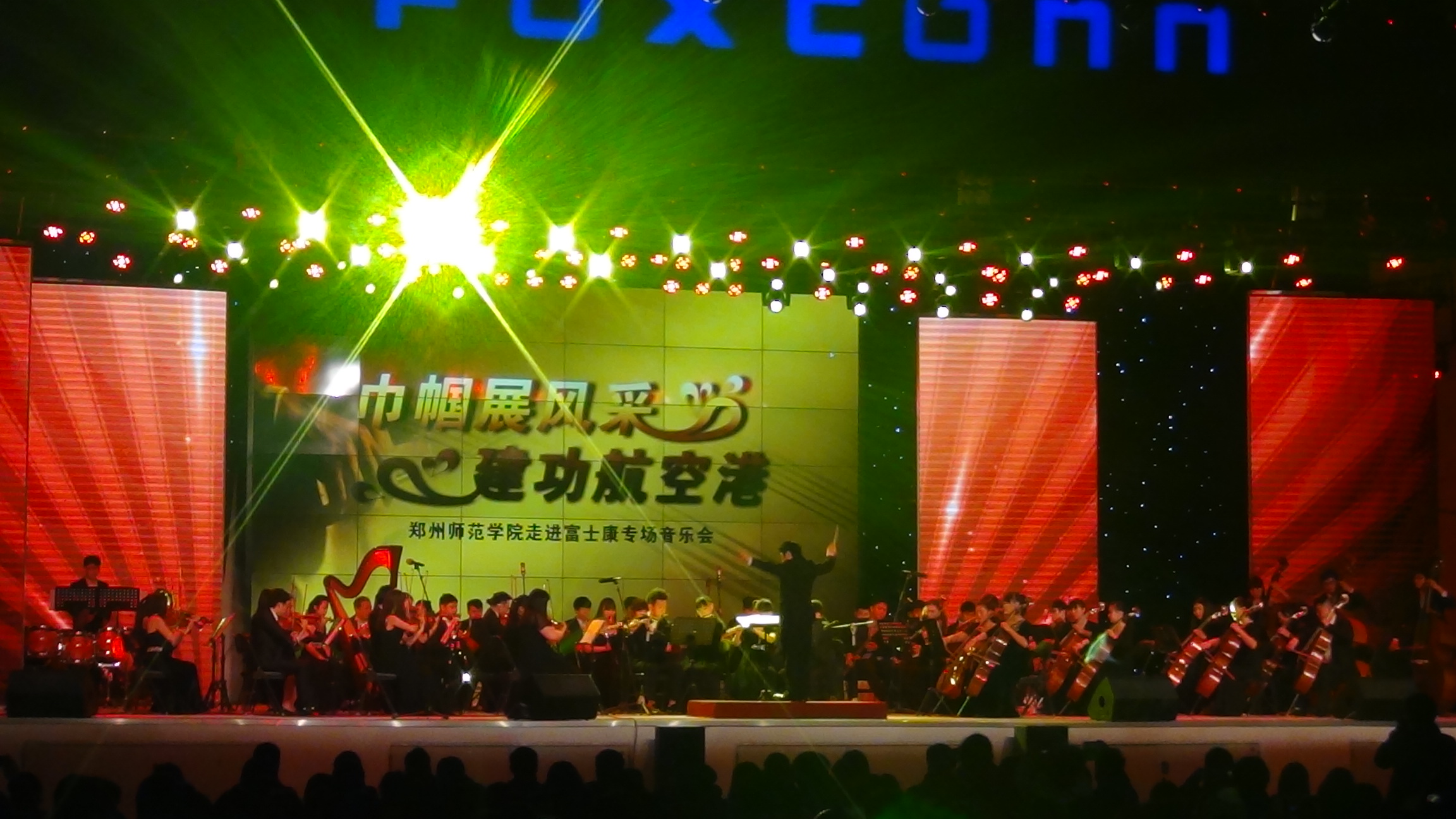 2014年3月6日晚,由我校联合航空港区管委会主办,音乐学院承办的“巾帼展风采,建功航空港”——走进富士康专场音乐会隆重上演。团省委副书记李若鹏、校党委副书记弓民、团市委书记张艳华、团省委办公室主任韩维俊、团省委宣传部部长宋晓波莅临音乐会现场。