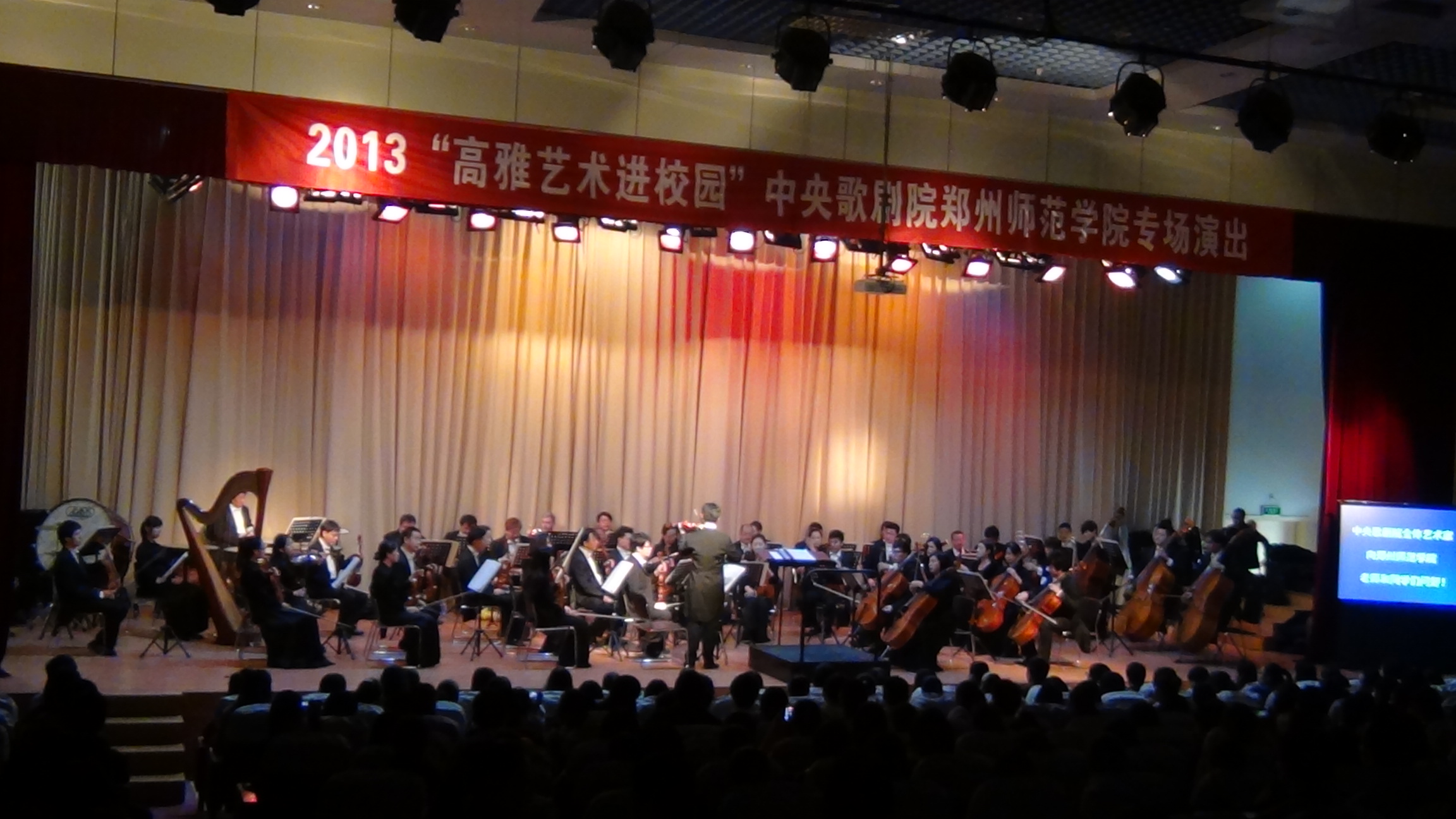2013年10月22日14:30,由教育部、文化部、财政部主办,河南省教育厅承办的2013年“高雅艺术进校园”活动——中央歌剧院《经典作品音乐会》在郑州师范学院七号楼学术报告厅举行,在校领导的关心下,为音乐学院全体师生做了专场演出。音乐学院院领导、部门领导、全体教职工和600名学生观看了此次演出。