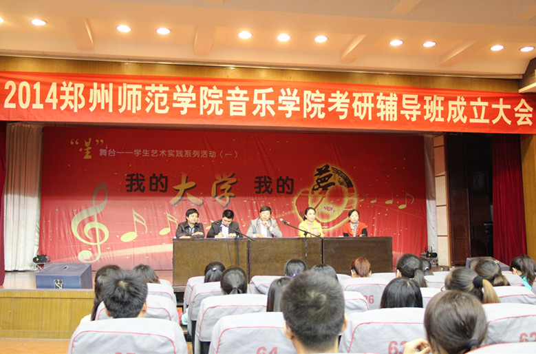 2013年10月22日17:00时,音乐学院在音乐厅召开2014考研辅导班成立大会,为准备参加考研的2010级音乐学本科班13名学生鼓劲加油,同时也为即将参加考研的其他年级学生进行动员。音乐学院负责人王国良教授、党总支工作负责人朱青教授以及相关部门领导出席大会。