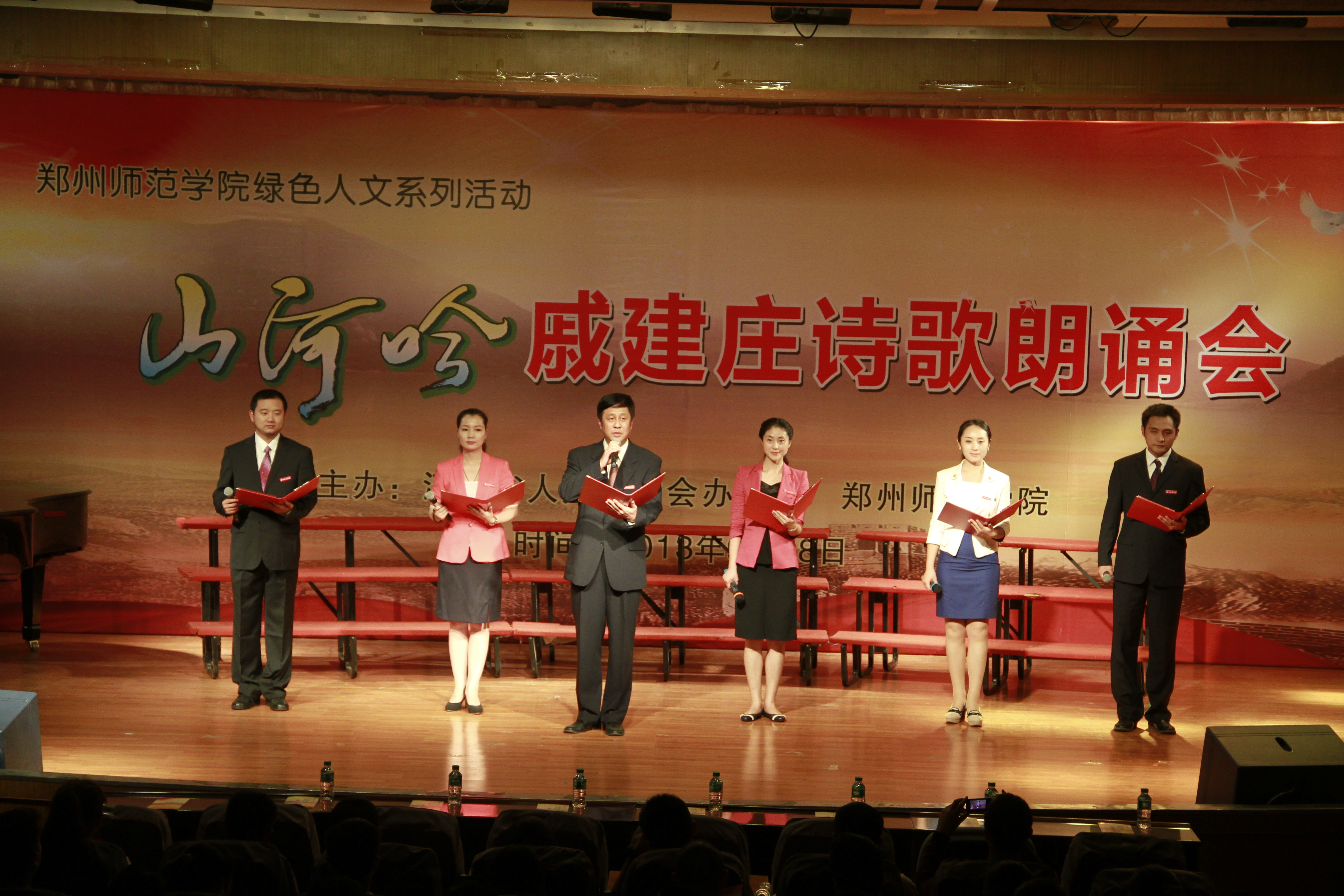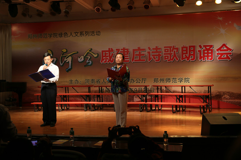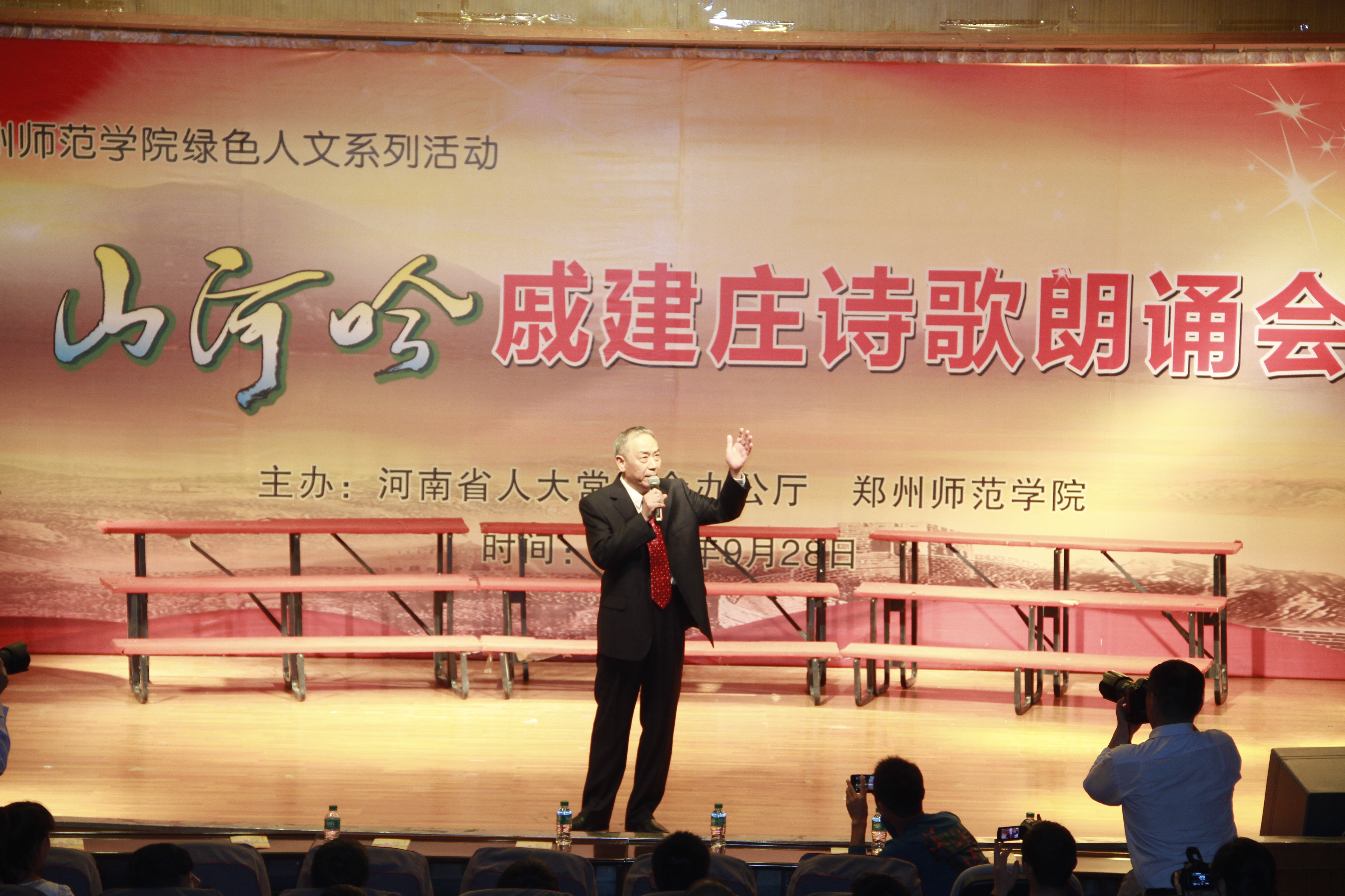 2013年9月28日下午,由河南省人大常委办公厅、郑州师范学院联合主办的《山河吟—戚建庄诗歌朗诵会》在音乐厅隆重举行。莅临此次朗诵会的领导有:省人大常委副主任、党组副书记蒋笃运,省人大常委会副主任李文慧,省人大常委会秘书长张启生,省人大常委、副秘书长戚建庄,省人大常委会纪检组长韩长峰,省人大常委、教科文卫主任詹玉荣,郑州市人大常委会主任白红战等;此外,我校党委书记于向英,党委副书记、校长赵健,党委副书记、工会主席弓民以及河南省广播电视大学、郑州轻工业学院、河南省牧业经济学院等部分省内院校党委书记或校长也出席了本次活动。