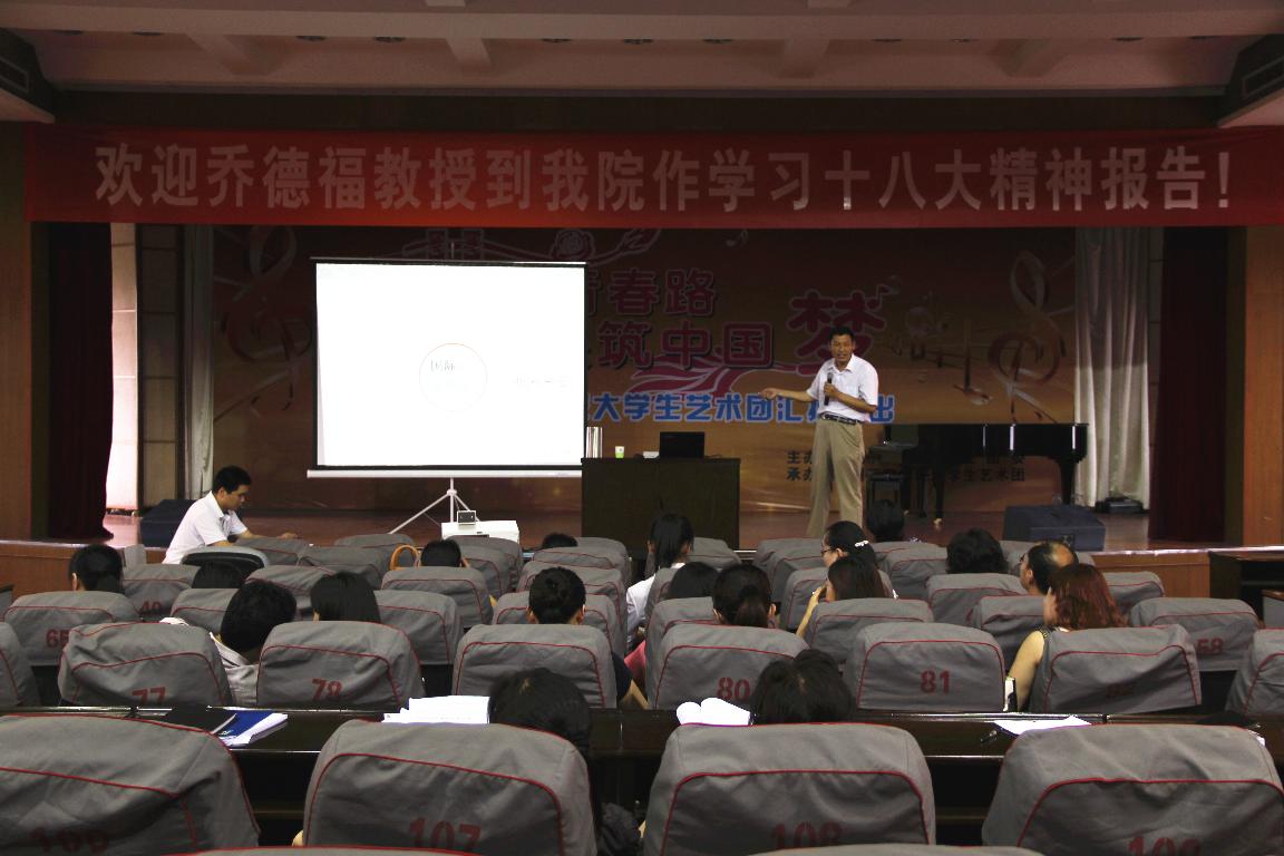 2013年6月9日,学校思想政治理论教学研究部主任乔德福教授来到音乐学院作学习十八大精神报告,音乐学院全体人员参加了报告会。