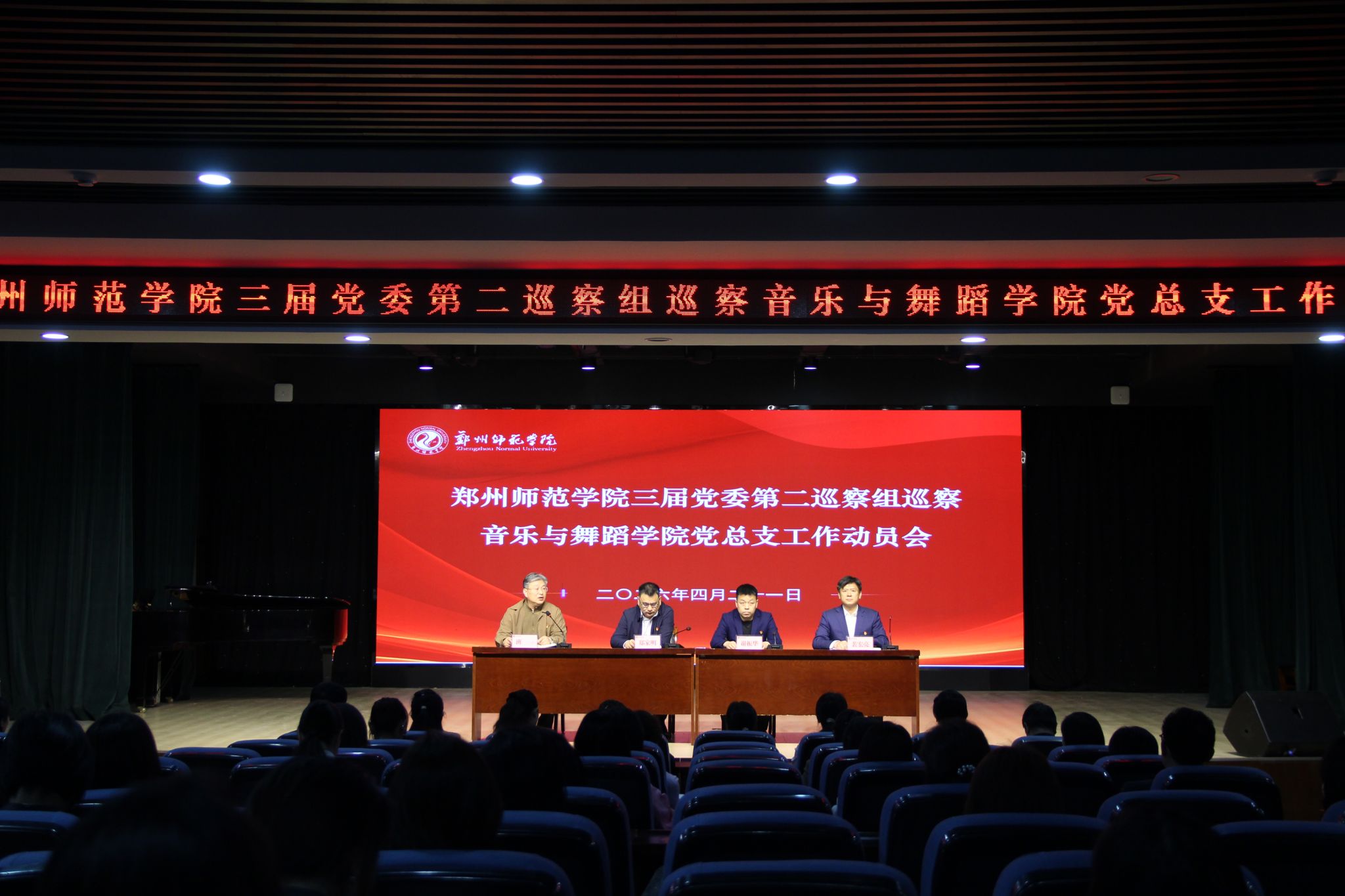 根据学校三届党委第三轮巡察工作统一部署,2026年4月21日,校党委第二巡察组巡察音乐与舞蹈学院党总支工作动员会顺利召开。会前,第二巡察组组长郑家明主持召开了音乐与舞蹈学院党政主要领导见面沟通会,通报了巡察工作安排。随后召开的动员会上,郑家明代表学校党委作了动员讲话,传达了学校党委对本轮巡察的有关精神并就做好巡察工作提出明确要求,巡察组副组长谢振华宣读了《中共郑州师范学院第三届委员会第三轮巡察工作实施方案》,音乐与舞蹈学院党总支书记裴宏亮作表态发言。