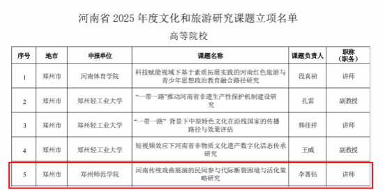 近日,河南省文化和旅游厅正式公布了2025年度文化和旅游研究课题立项名单(豫文旅科教〔2025〕7号)。经专家评审、社会公示等严格程序,我院李菁钰博士申报的课题《河南传统戏曲展演的民间参与代际断裂困境与活化策略研究》成功获批立项。据悉,在本年度全省立项的149个项目中,李菁钰博士的课题是郑州师范学院唯一获批的项目,彰显了我院在文化和旅游研究领域的学术实力与独特优势。