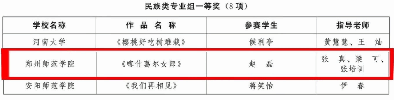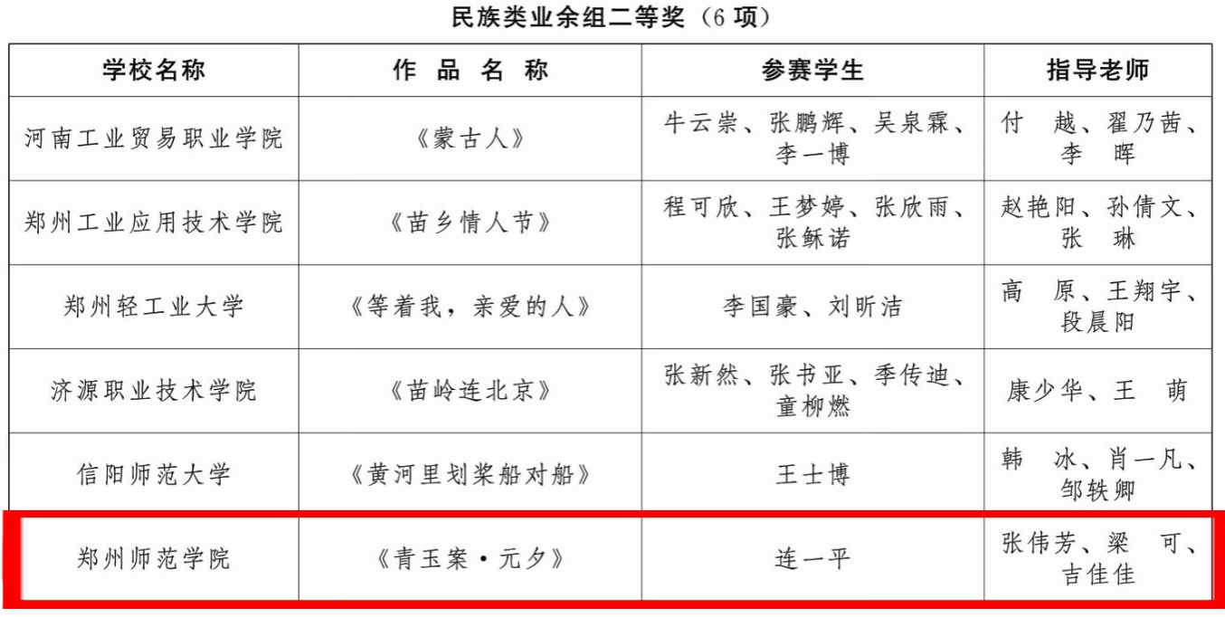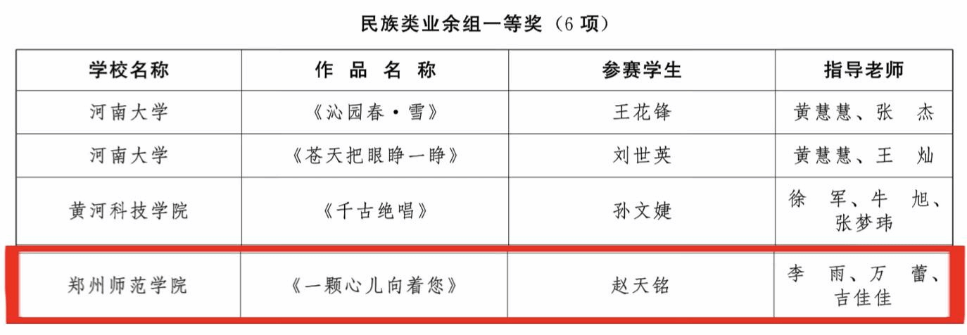 民族类(业余组):一等奖《一颗心儿向着您》;二等奖:《青玉案·元夕》