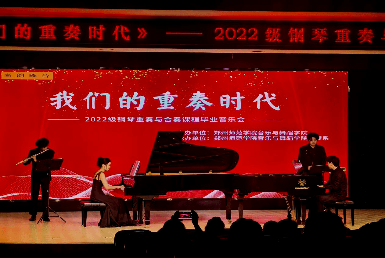 12月26日晚,音乐与舞蹈学院尚韵舞台之“我们的重奏时代”——《钢琴重奏与合奏课程》毕业音乐会在尚韵楼音乐厅成功举行。本次音乐会由钢琴系郭红丽副教授指导,2022级学生集体呈现,集中展示了这门课程的教学成果,体现了学院在音乐教育人才培养方面的实践与探索,学院领导、系部教师及学生代表共同出席了音乐会。