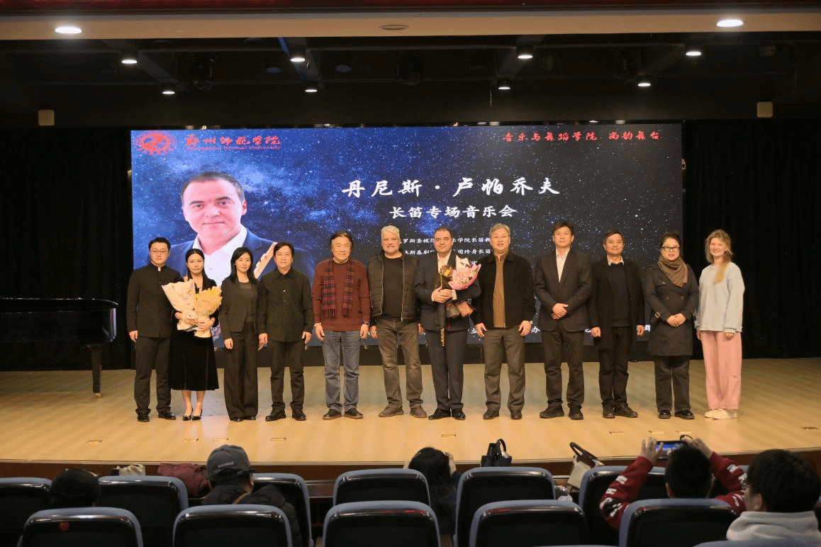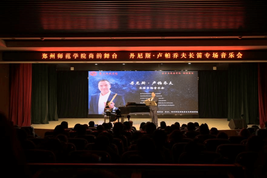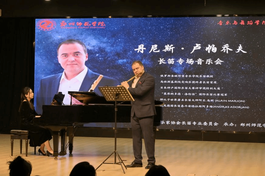 3月13日由河南省音乐家协会长笛专业委员会主办、郑州师范学院音乐与舞蹈学院承办的“尚韵舞台:圣彼得堡的金色笛声——丹尼斯·卢帕乔夫长笛专场音乐会”隆重上演。俄罗斯圣彼得堡国立音乐学院教授、马林斯基剧院交响乐团终身长笛首席丹尼斯·卢帕乔夫携手钢琴艺术指导汪旋,为全院师生与中原观众献上一场跨越巴洛克至当代的顶级长笛艺术盛宴。